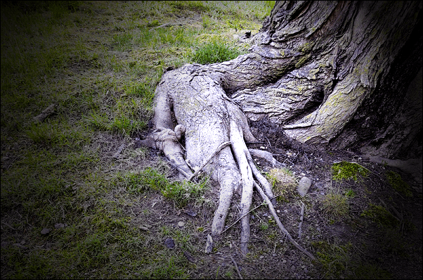 She understood. Her tree was trying to protect her. She laid back, her head against the wood. She listened as the tree absorbed her, turning her into wood. Her consciousness joined the others. After her transformation, she simply resembled a long, knobby, albeit strangely shaped root.